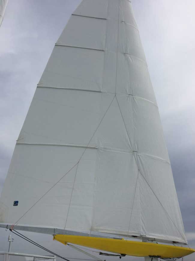 Ayant déjà pas mal navigué et construit de nombreux bateaux je voulais pour mon dernier cata de croisière un gréement simple sans beaucoup d'efforts sur la structure et efficace. Résultat: gréement biplan avec deux ailes souples.