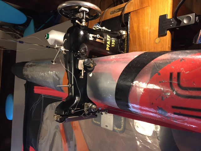 Mon 1er essai de couture de voilerie vient de commencer. C'est un remplacement de panneau monofilm sur une voile de windsurf. Alors que ma Cosson zigzag de 1963 n'y parvenait pas, la Pfaff 130 pique toutes les couches en zigzag et sans difficulté (monofilm x2 couches, + insignia x2 ou x4, + adhésif double face). J'utilise une aiguille universelle taille 120 et du fil V92. Mais je vais devoir m'améliorer sur l'alignement des 2 lignes de zigzag et le réglage de tension du dessus pour avoir un beau zigzag en dessous. J'ai l'impression qu'il ne faudra pas hésiter à tendre assez fort.